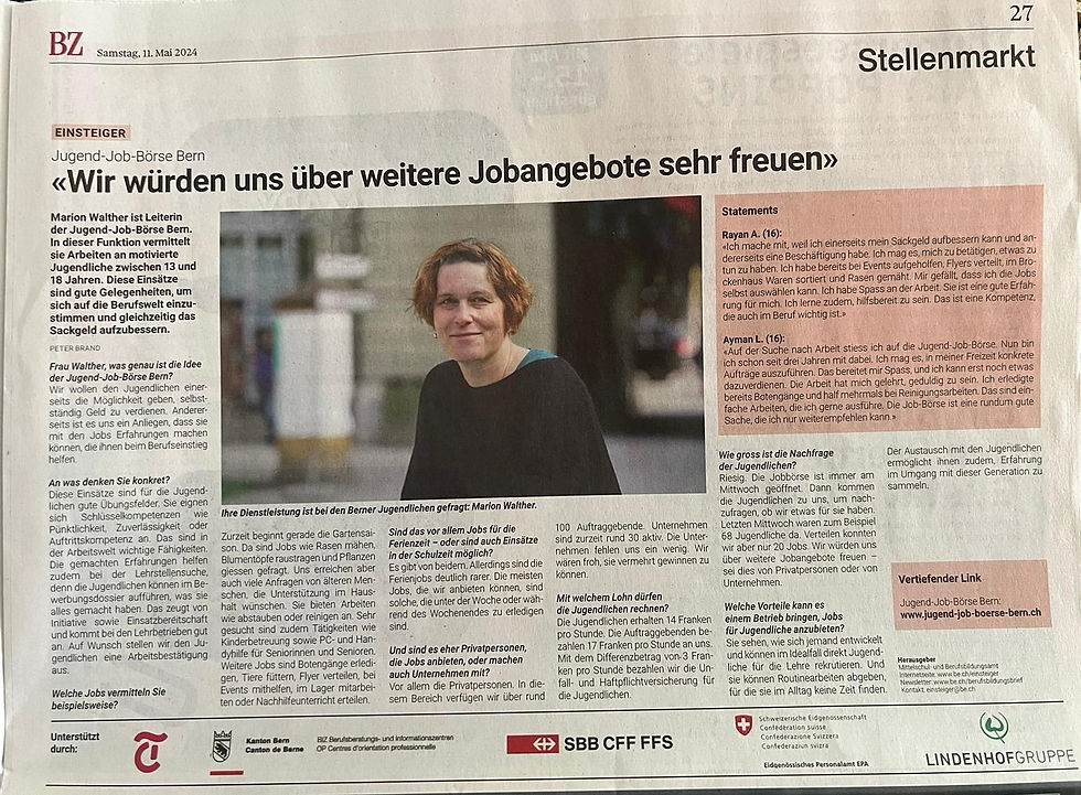 Jugendliche sind motiviert für Ferienjobs und WochenplätzeMarion Walther17. Mai 20241 Min. LesezeitEin wohlwollendes Porträt mit Statements zweier Jugendlicher, die bereits viel Erfahrung mit Sackgeldjobs haben.Zum Artikel